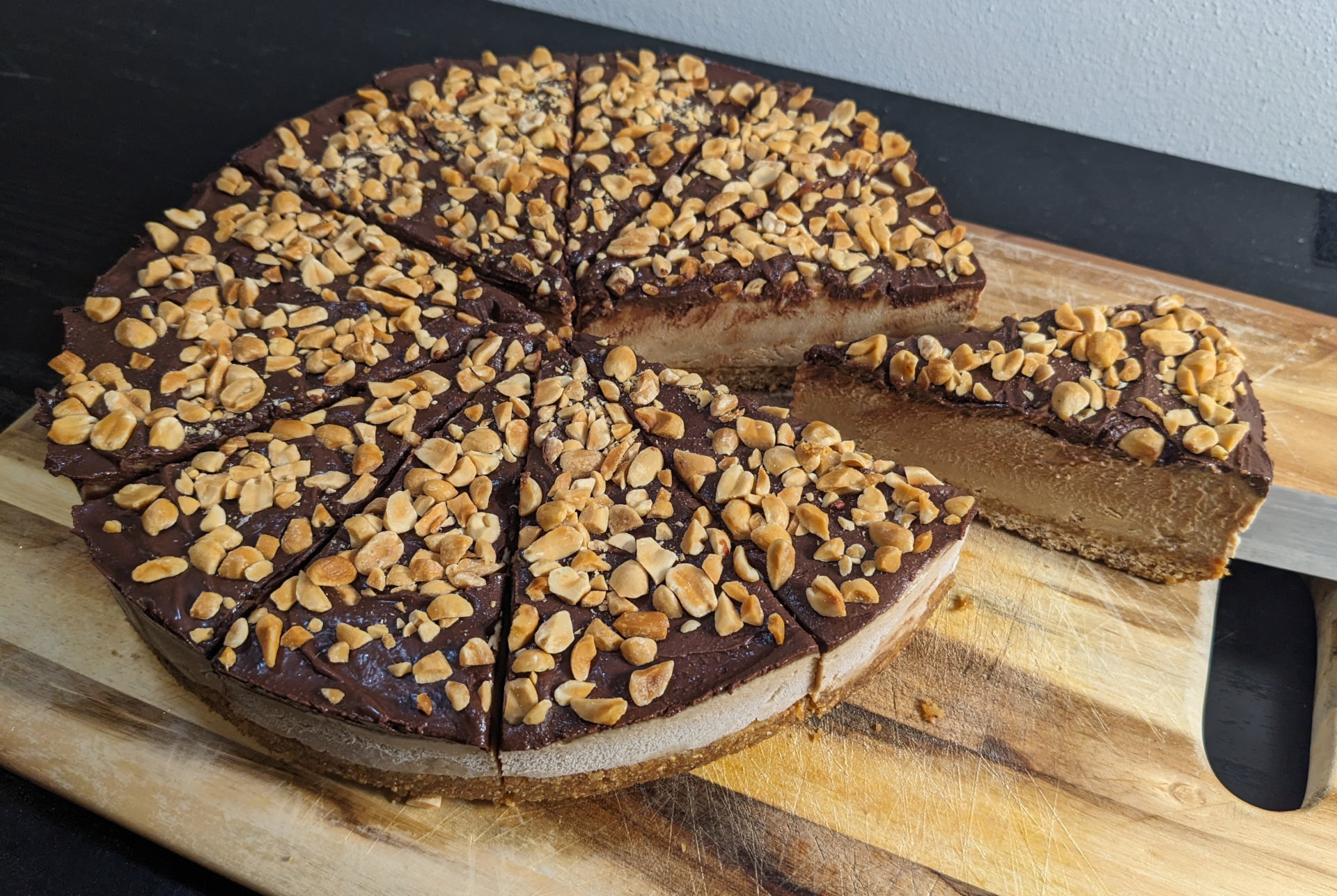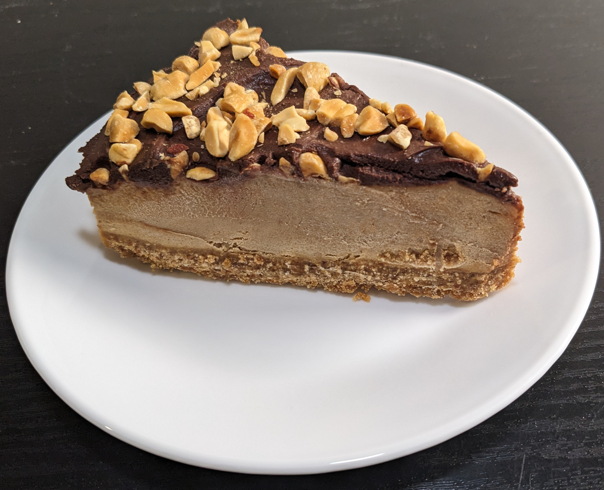 The filling is rich and peanut buttery while still having a lightness to it. It's a lot like a peanut butter flavored pudding or cream filling because that's more or less what it is. The crust, ganache topping, and peanut topping add more peanut flavor and complimentary chocolate flavors as well as a pleasant variety of textures. Despite being as rich as it is, I don't feel guilty eating this like I would after eating a traditional cheesecake or dairy-based pie.